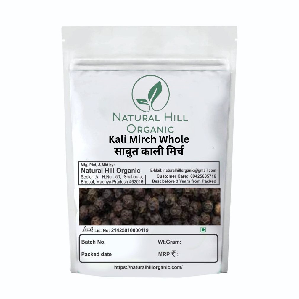 Natural Hill Organic Kali Mirch Whole is premium quality black peppercorns, carefully selected and packed to preserve natural aroma and freshness. Perfect for cooking, seasoning, and adding a rich, spicy flavor to your dishes. Packed hygienically with no artificial additives.