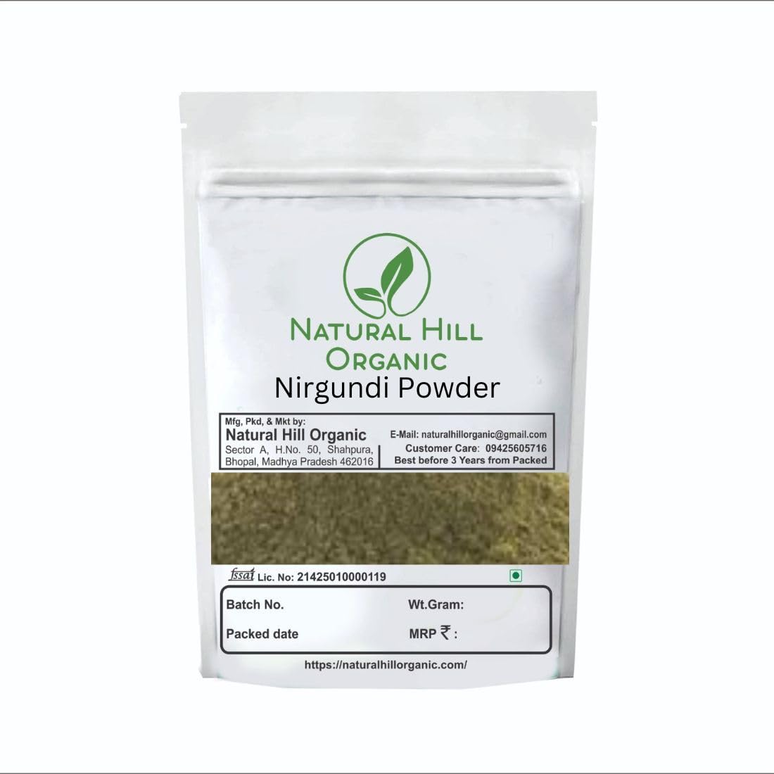 Natural Hill Organic Nirgundi Leaves Powder is prepared from carefully selected nirgundi leaves that are cleaned, shade-dried and finely ground using standard processing practices. This powder is traditionally used in herbal preparations and general lifestyle routines. It is suitable for traditional and general use without any medicinal or therapeutic claims.